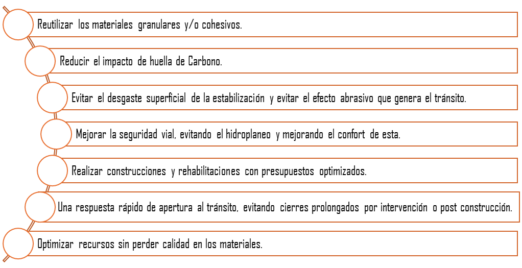 Al estabilizar suelos con aditivo liquido iónico PROES, permite el reciclaje de diferentes tipos de materiales granulares, mejorando su desempeño geomecánico, logrando capas de base y/o subbase con alta capacidad de soporte, desarrollada y patentada por PROESTECH desde 1999; trabaja sobre la parte cohesiva de los suelos, generando matrices semi ligadas que permiten el incremento sustancial de la capacidad portante del suelo, logrando una estabilidad energética para una estructura resistente, estable, flexible y durable, evitando y mitigando la fisuración y fragilidad de los suelos tratados con aditivos cementantes, lo cual la hace idónea para la implementación de tratamientos superficiales o mezclas asfálticas de espesores reducidos (5cm), en donde la principal función de estas carpetas de rodado es proteger la estabilización, alargar la vida útil de la estabilización, y evitar el efecto abrasivo que generan los vehículos sobre esta capa estabilizada.