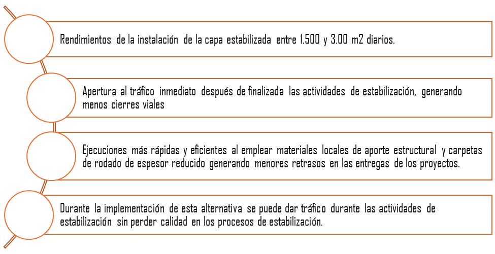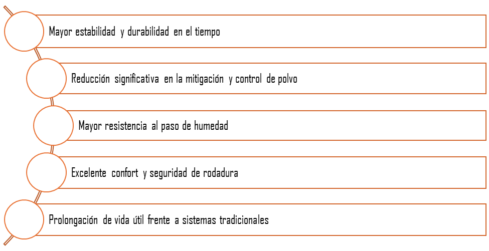 La estabilización con PROES permite generar una capa estructural de alta resistencia, donde su estructura físico-química, soporta las demandas más importantes de tránsito, lo cual permite utilizar carpetas de rodado de espesores reducidos, destinadas únicamente a proteger la estabilización y soportar la acción abrasiva del tránsito, brindando confort, seguridad y evitando el hidroplaneo de los usuarios.